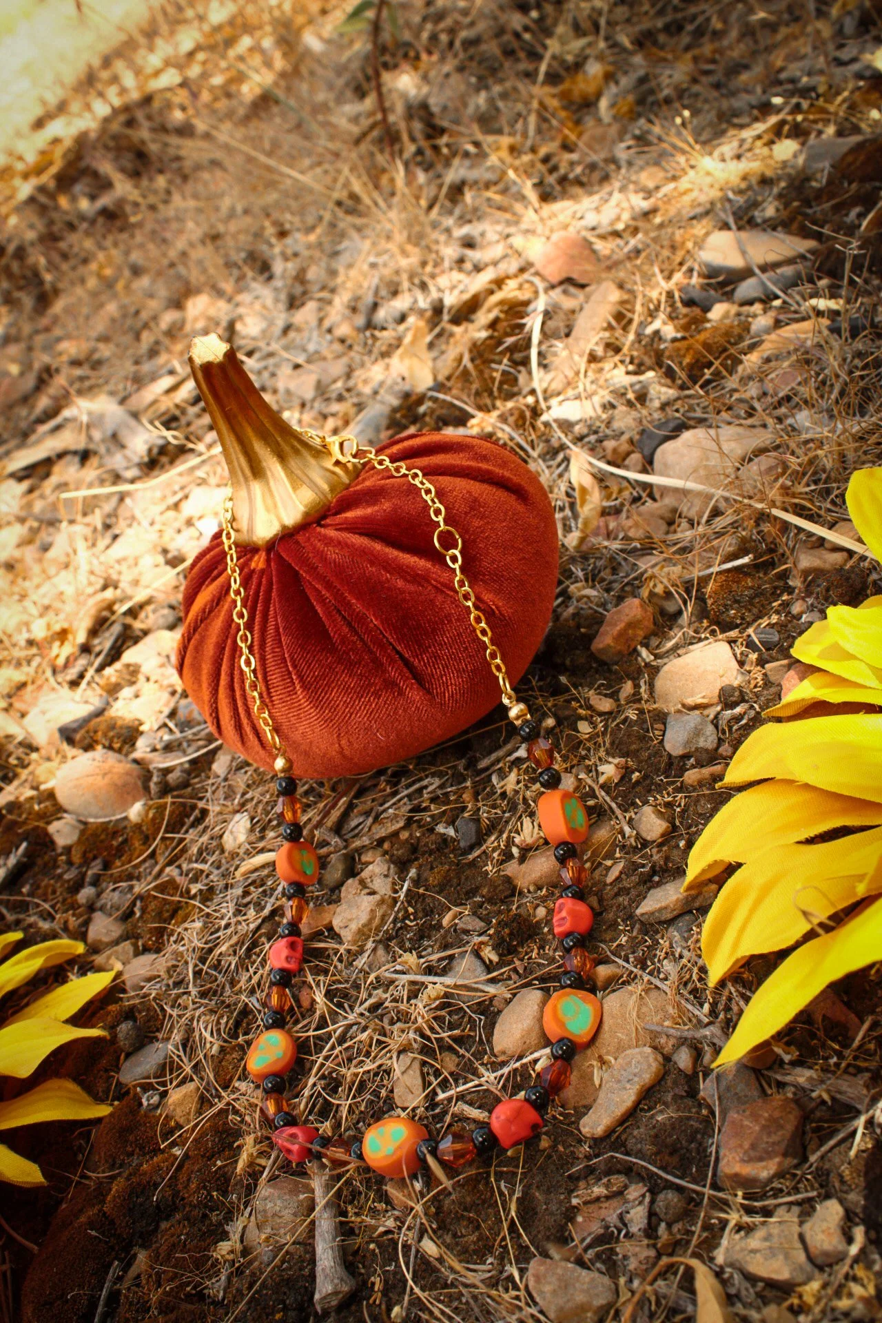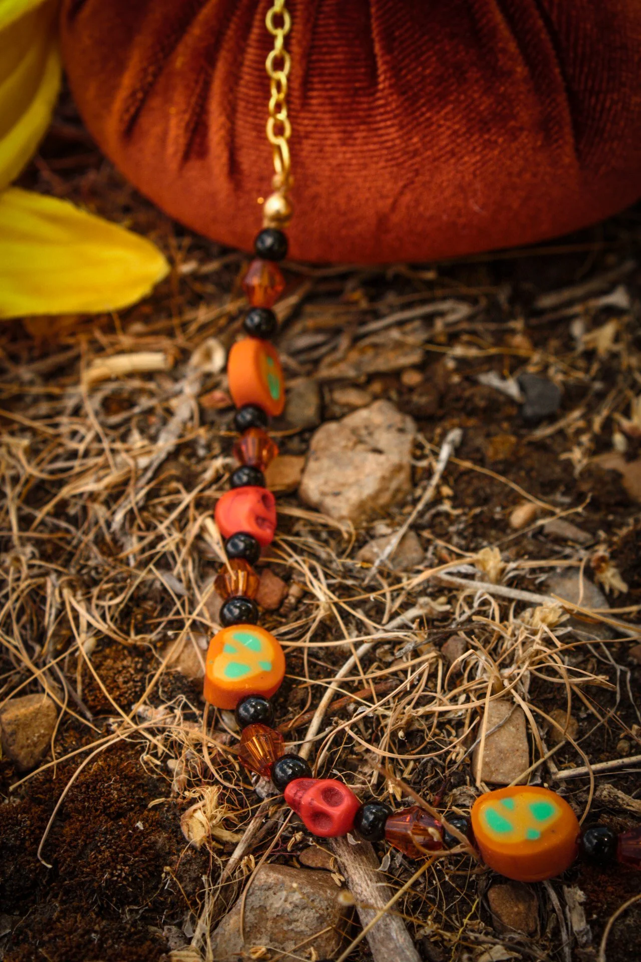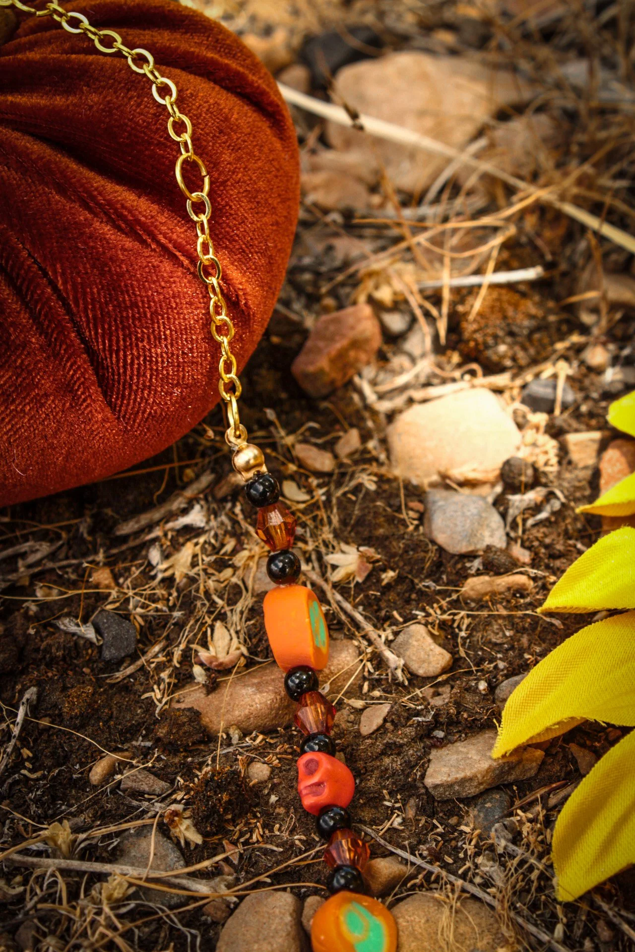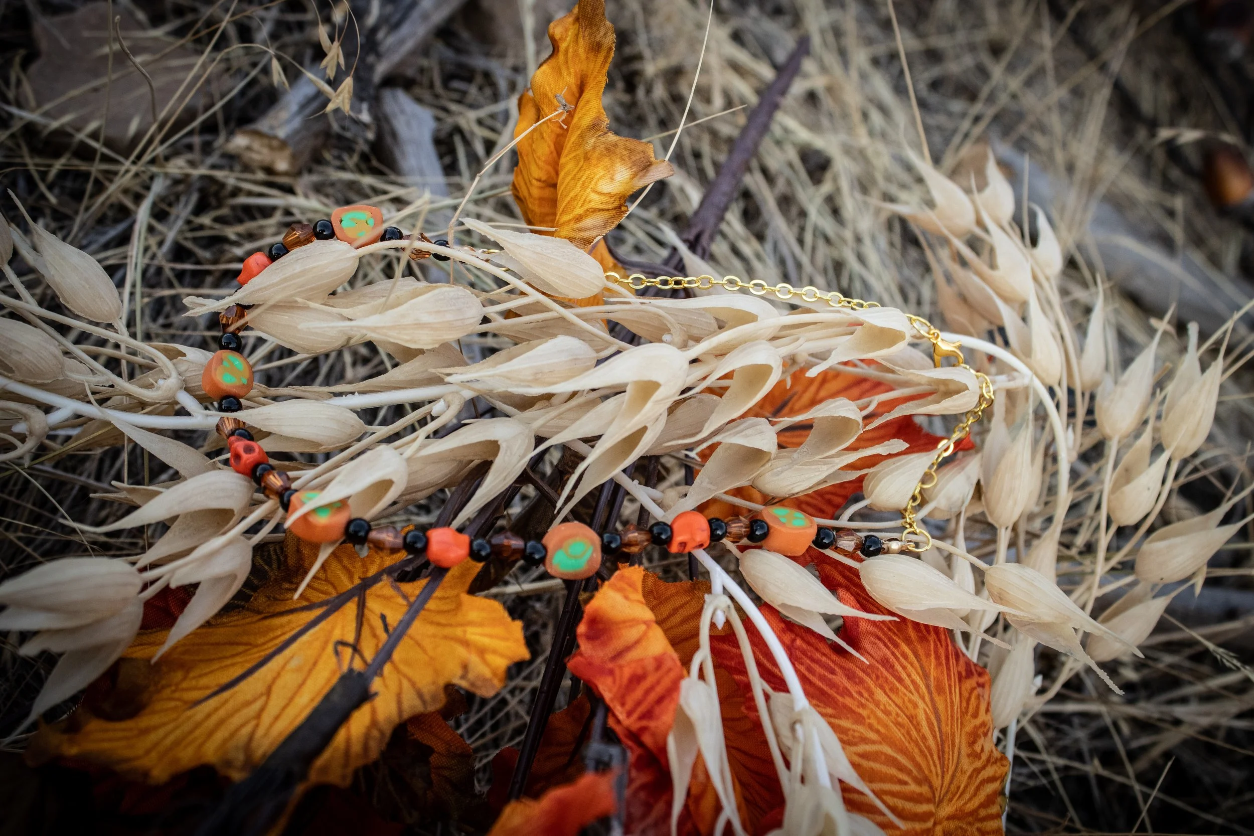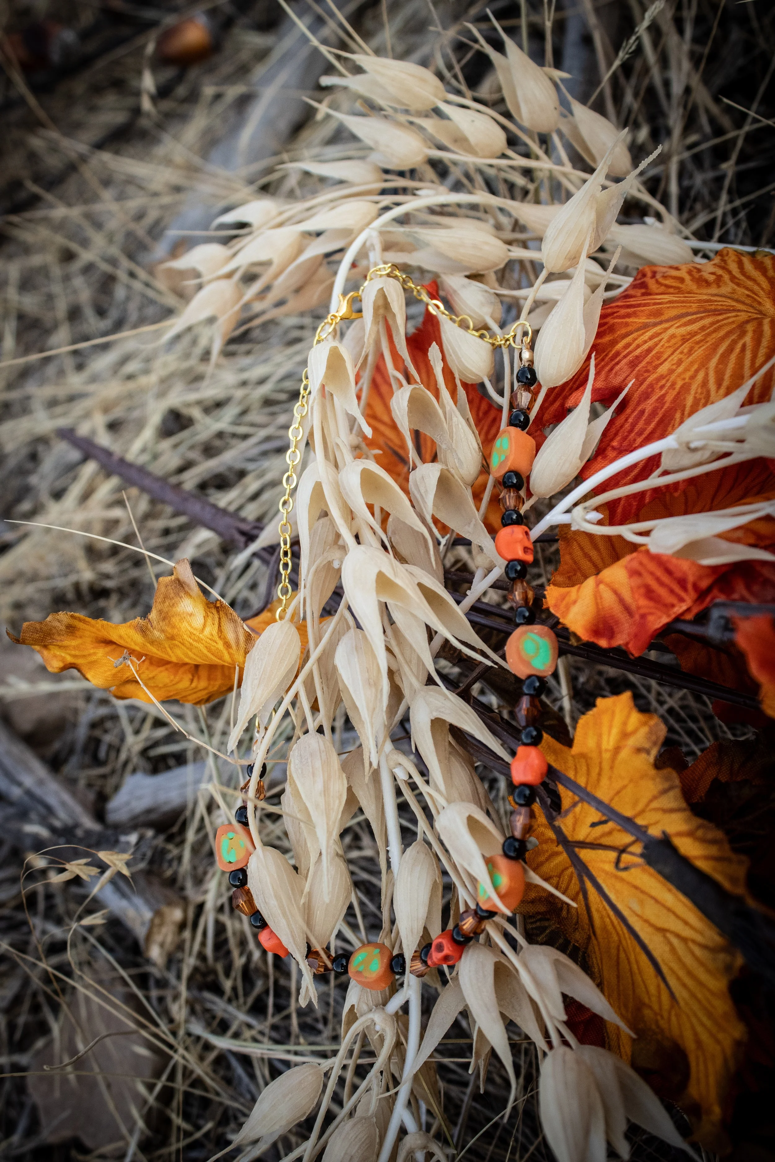 This festive necklace was made with a gold colored chain connected to my handmade orange clay disc beads with bright green accents, orange howlite stone bead, black acrylic beads and amber colored faceted beads.
