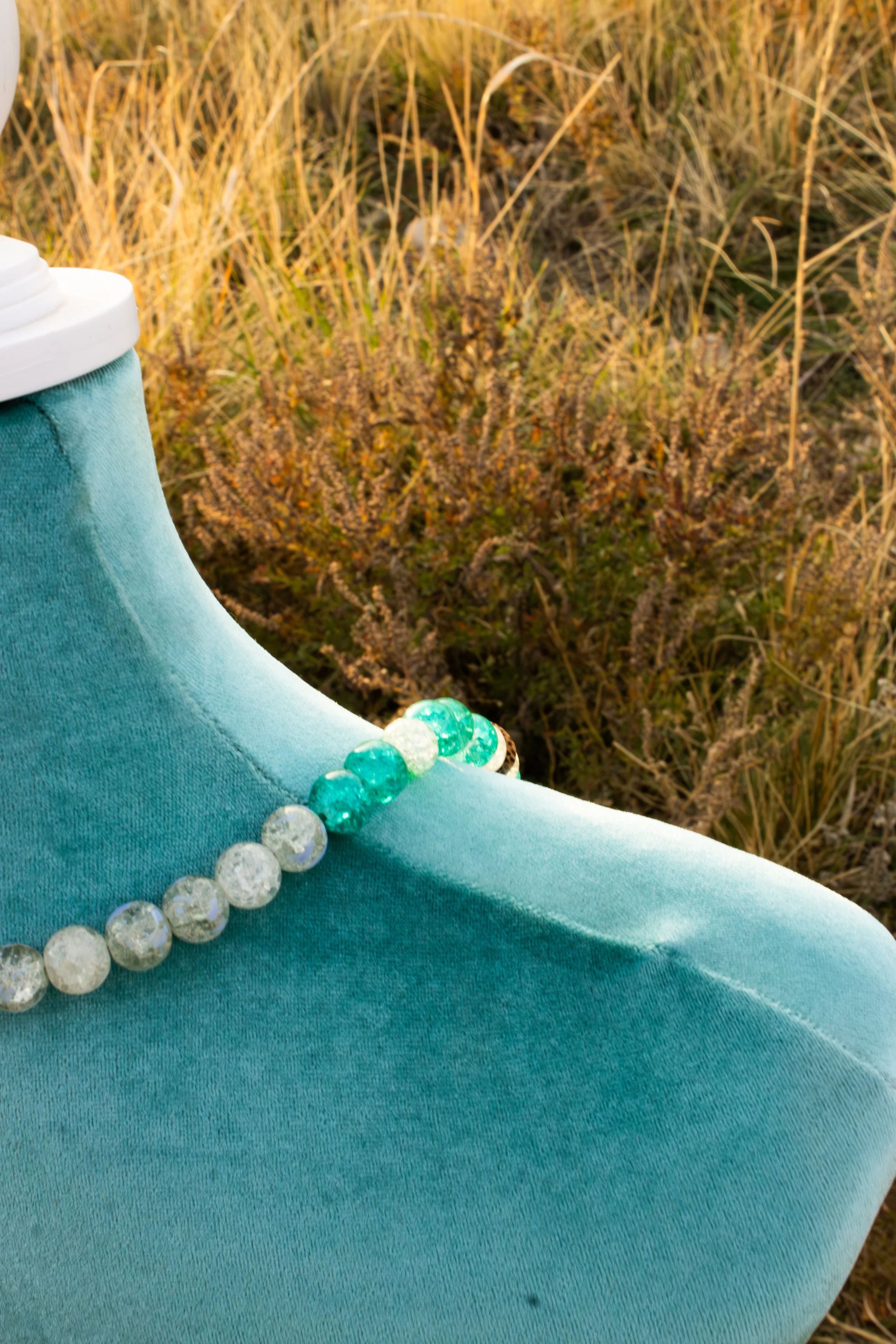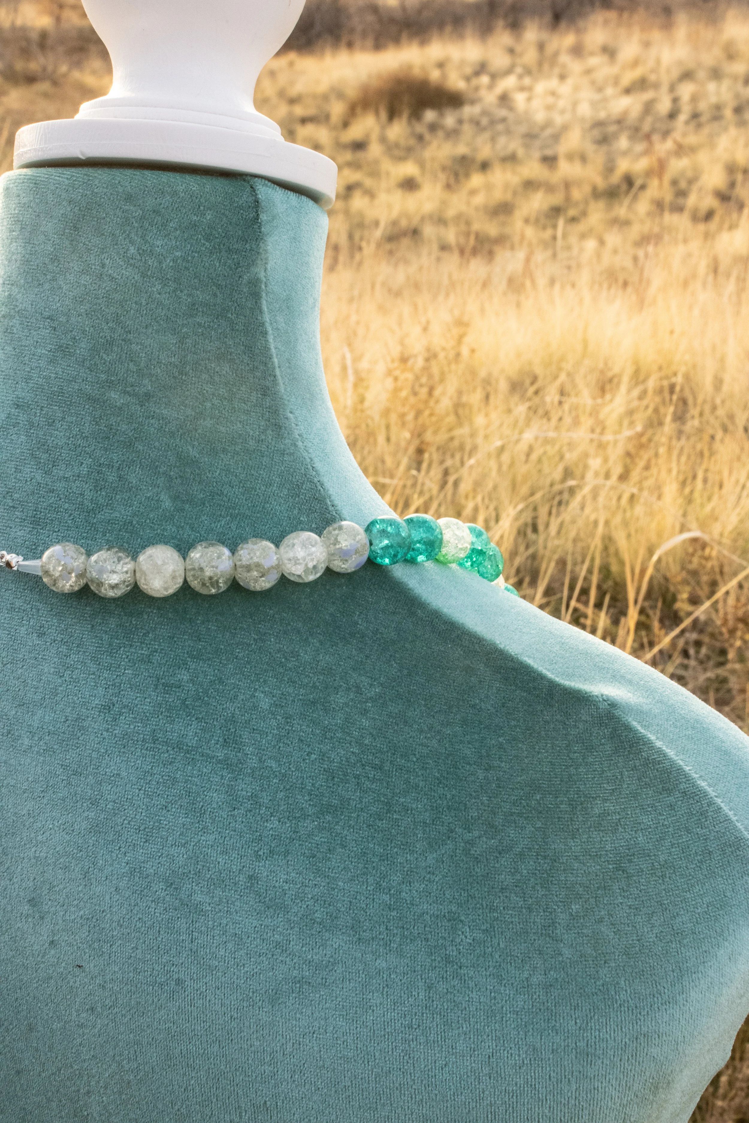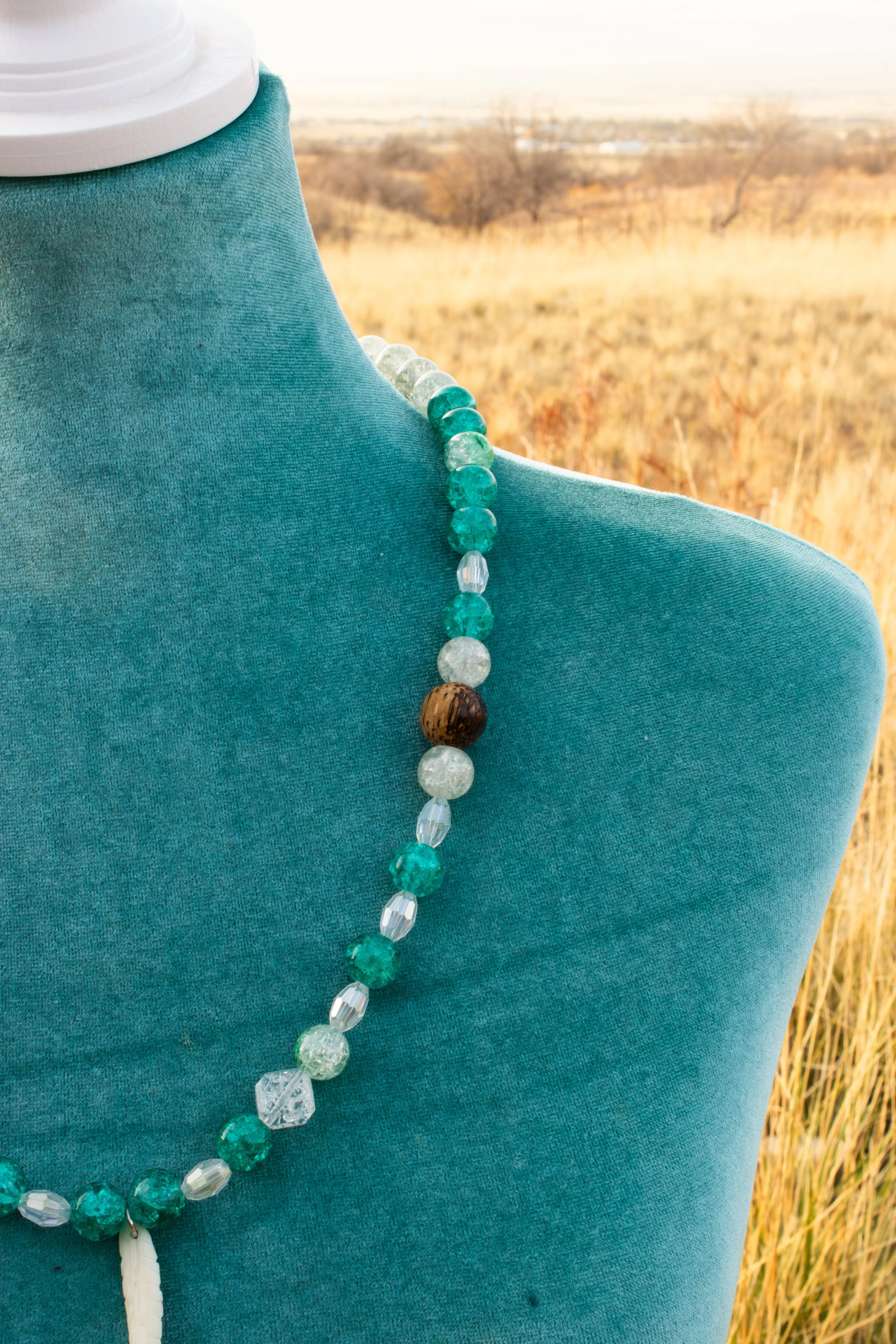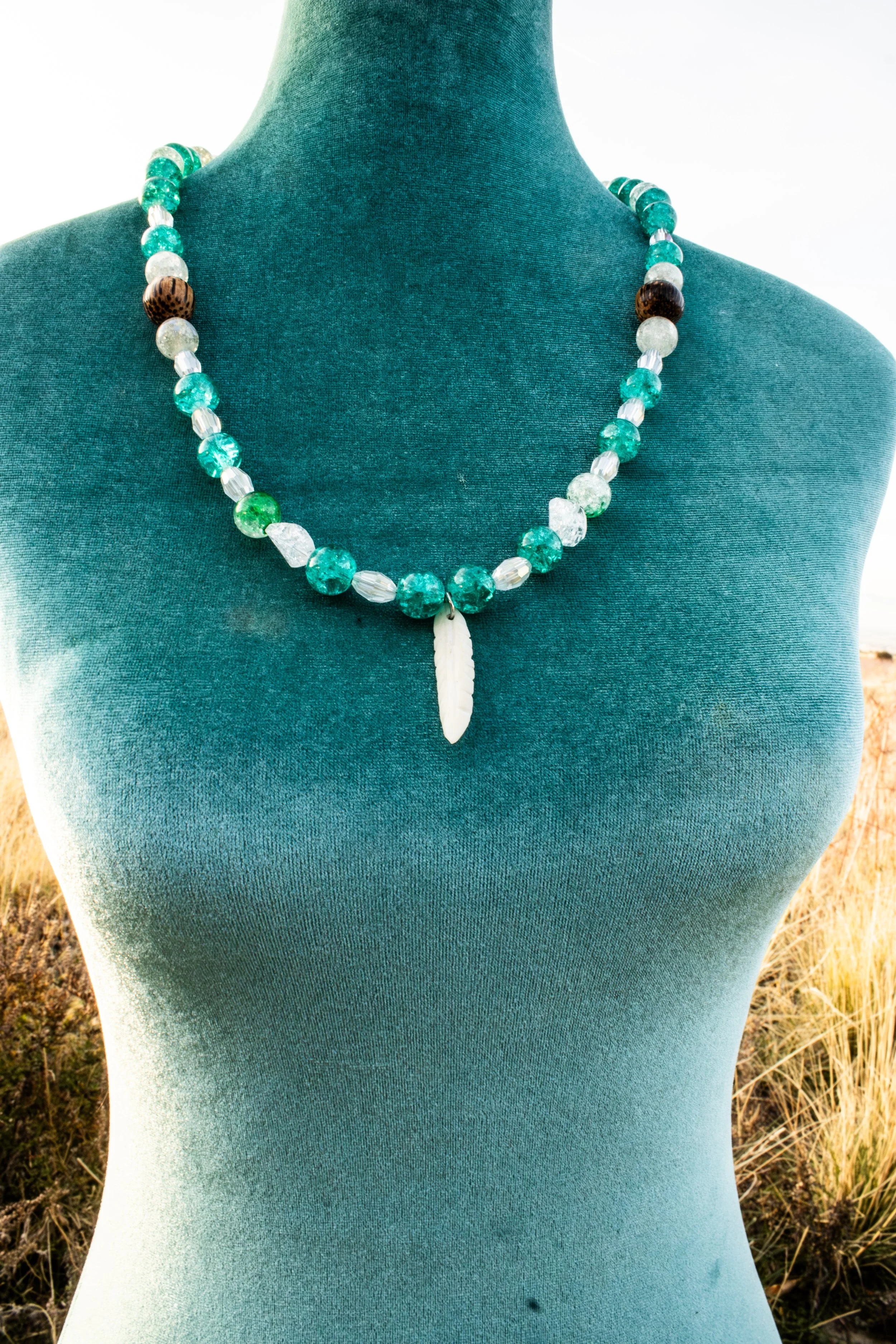 Bring a touch of winter magic to your style with my enchanting beaded necklace. Featuring sparkling glass beads in shades of forest green, emerald and clear frost, this piece captures the essence of a serene winter morning. My hand carved bone feather pendant was used to complete the look