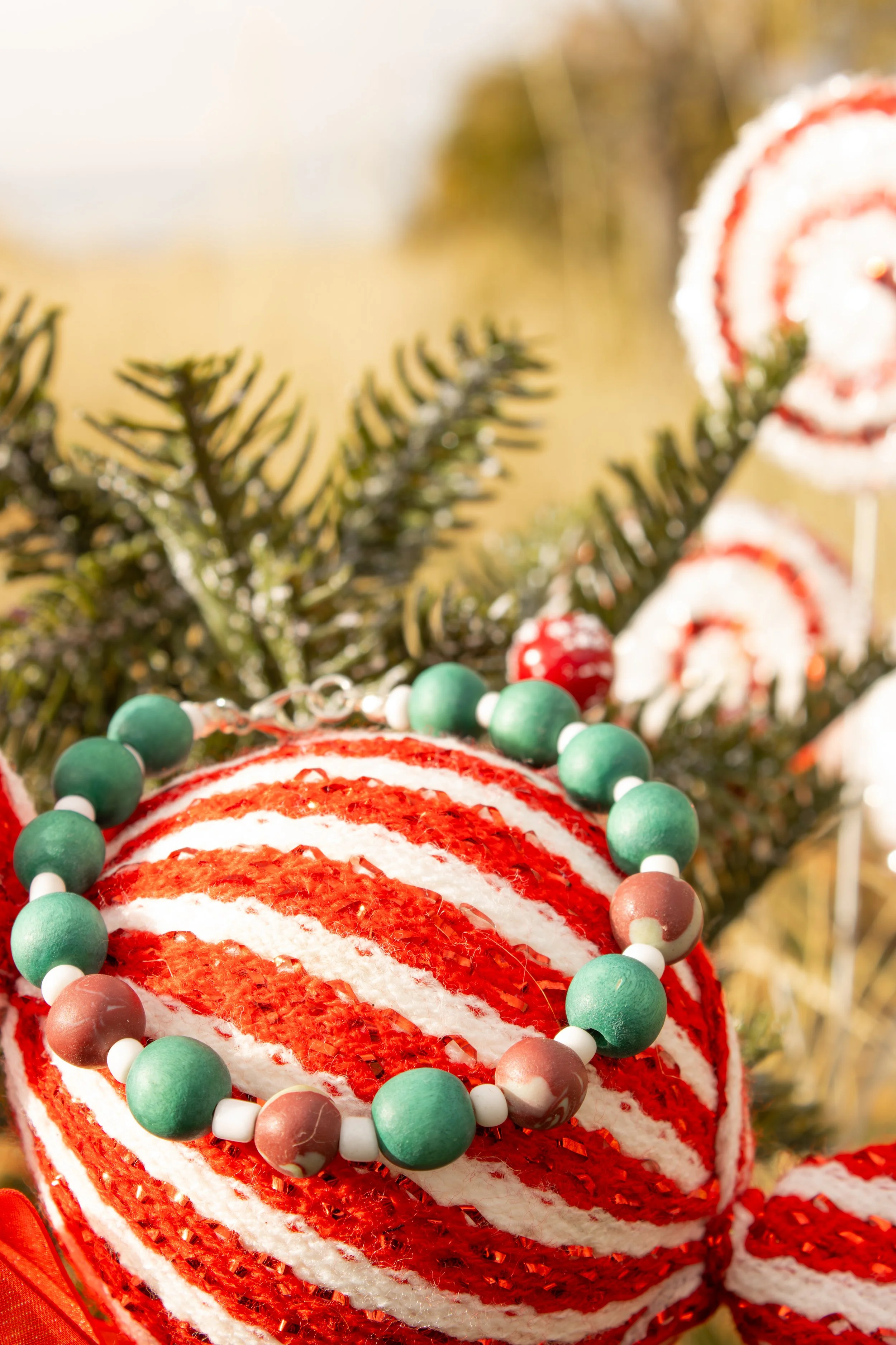 Celebrate the season with my handmade bracelet, made using pine green wood beads, white glass beads and my handmade red and green clay beads.